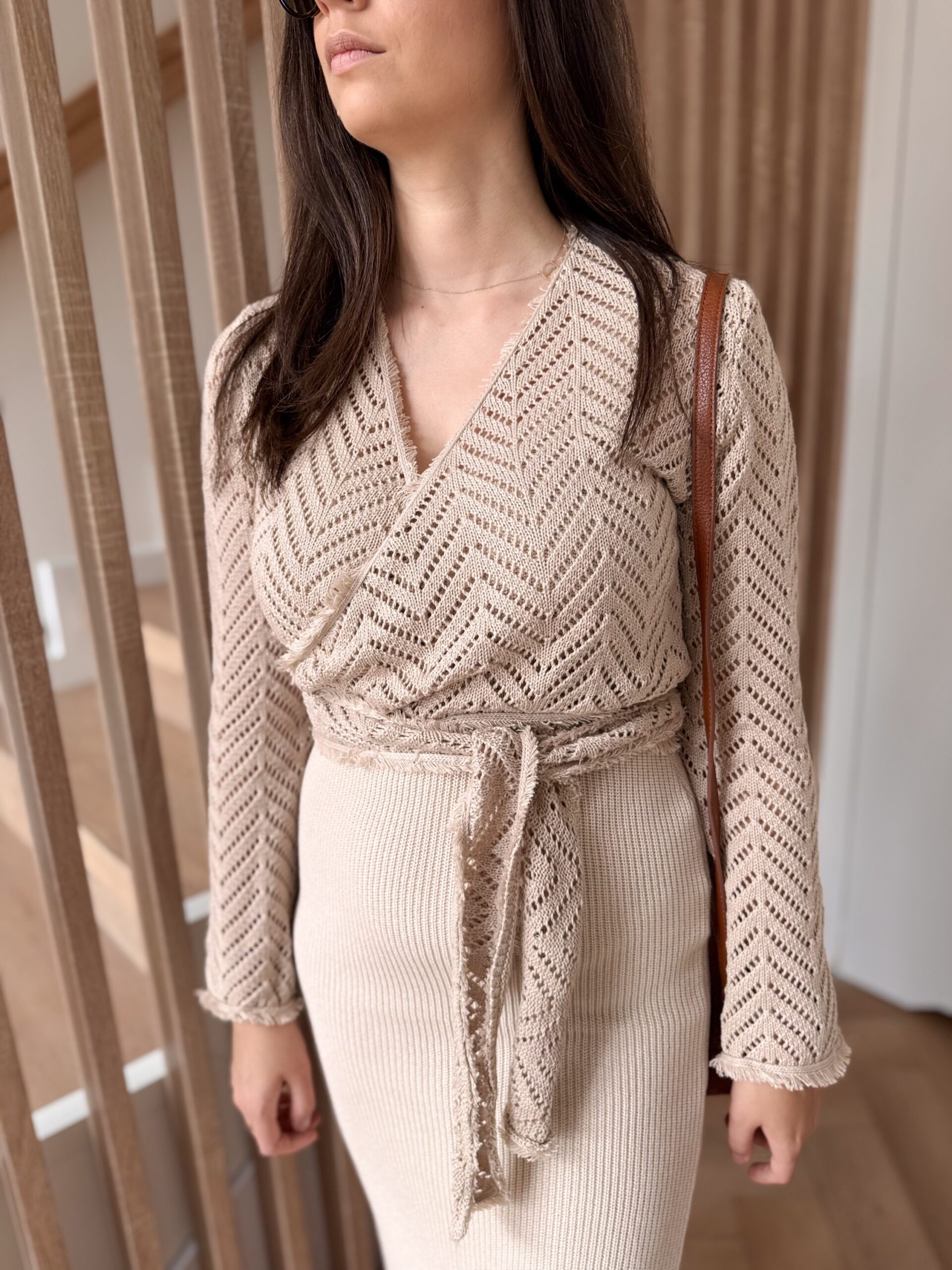 Neutralny kolor ciemnego beżu nadaje stylizacji ciepła i subtelności, czyniąc ją idealną na różne okazje – od spotkań towarzyskich po relaksujące chwile w domowym zaciszu. Sweterek BALI może być noszony jako lekka narzutka lub samodzielny element stroju, w zależności od potrzeb i preferencji.