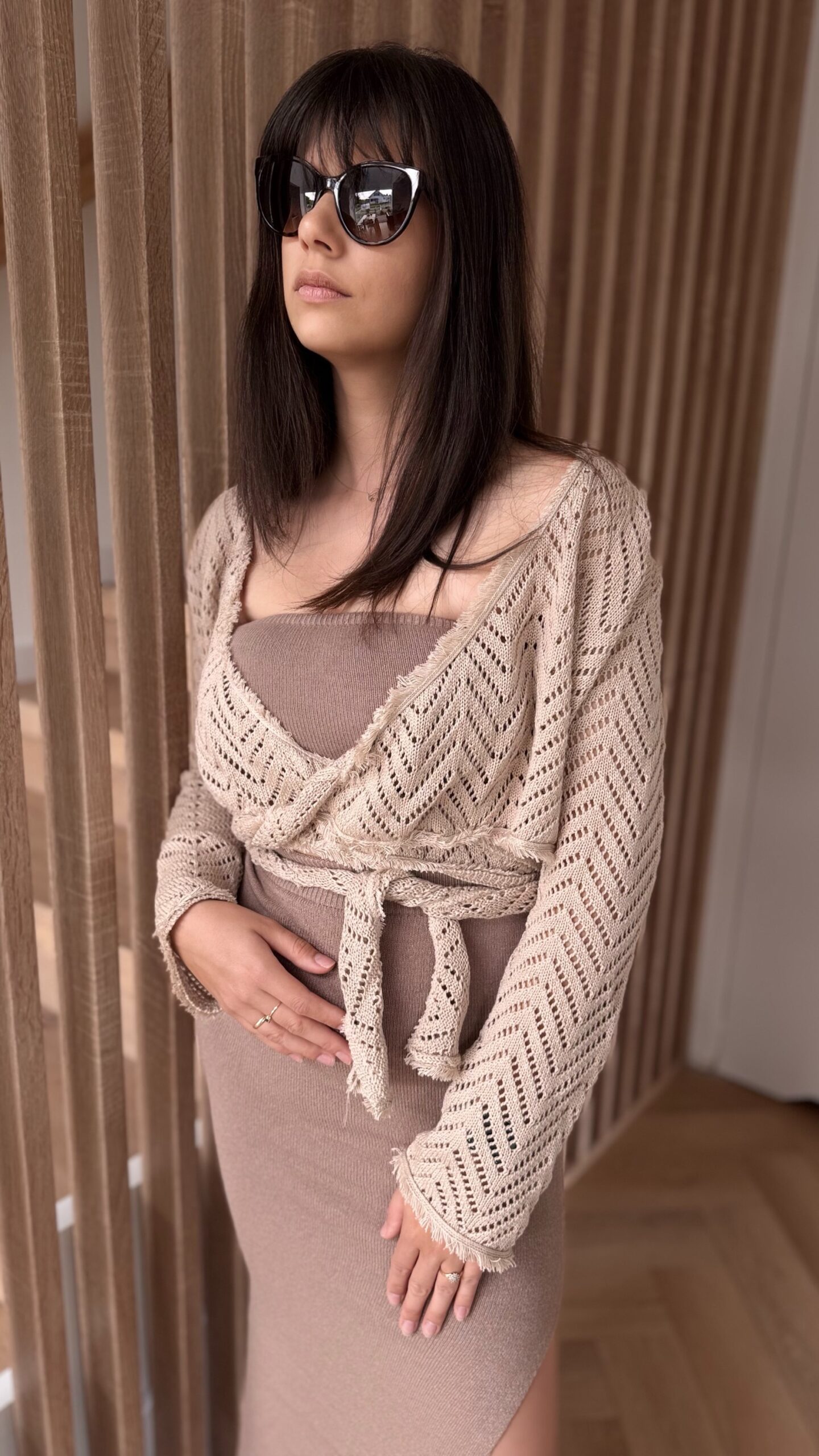 Wykonany z wysokiej jakości, elastycznego materiału z dodatkiem kaszmiru, komplet MEDUSA jest przyjemny w dotyku i miękko otula ciało. Ciepły, neutralny odcień mokka dodaje stylizacji klasy i subtelności, czyniąc ją idealną na letnie przyjęcia, romantyczne wieczory czy eleganckie wyjścia.